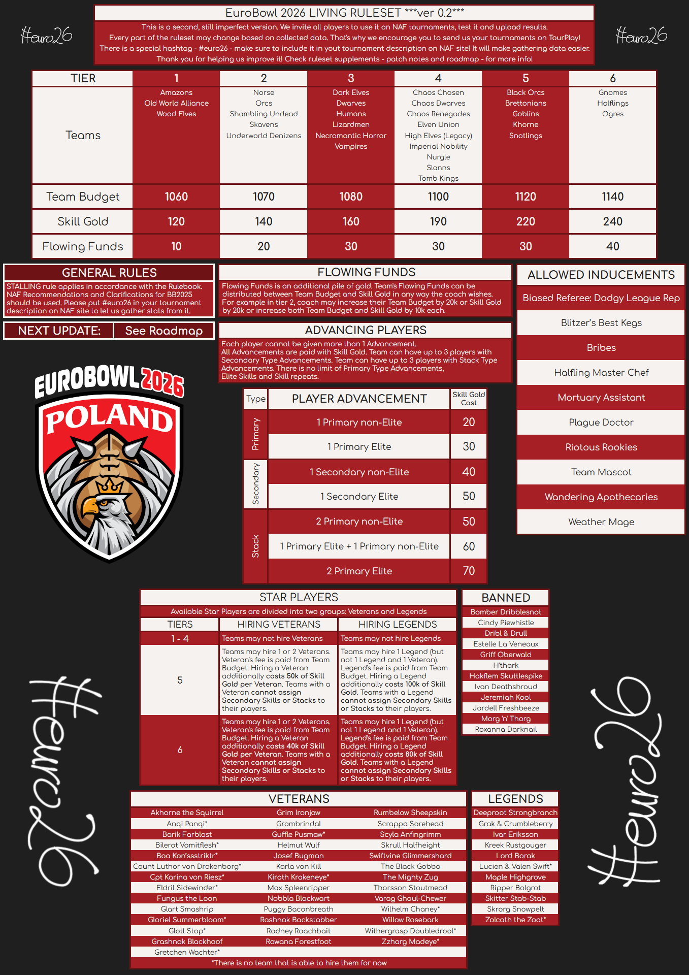 Jedes ausrichtende Eurobowl-Land kann in Rücksprache mit dem amtierenden Eurobowl Komitee die Regeln zur Squad- und Teamerstellung beim Eurobowl und den Eur´Open frei bestimmen. Das aktuelle Regelwerk für den Eurobowl 2026 erstellt Polen.